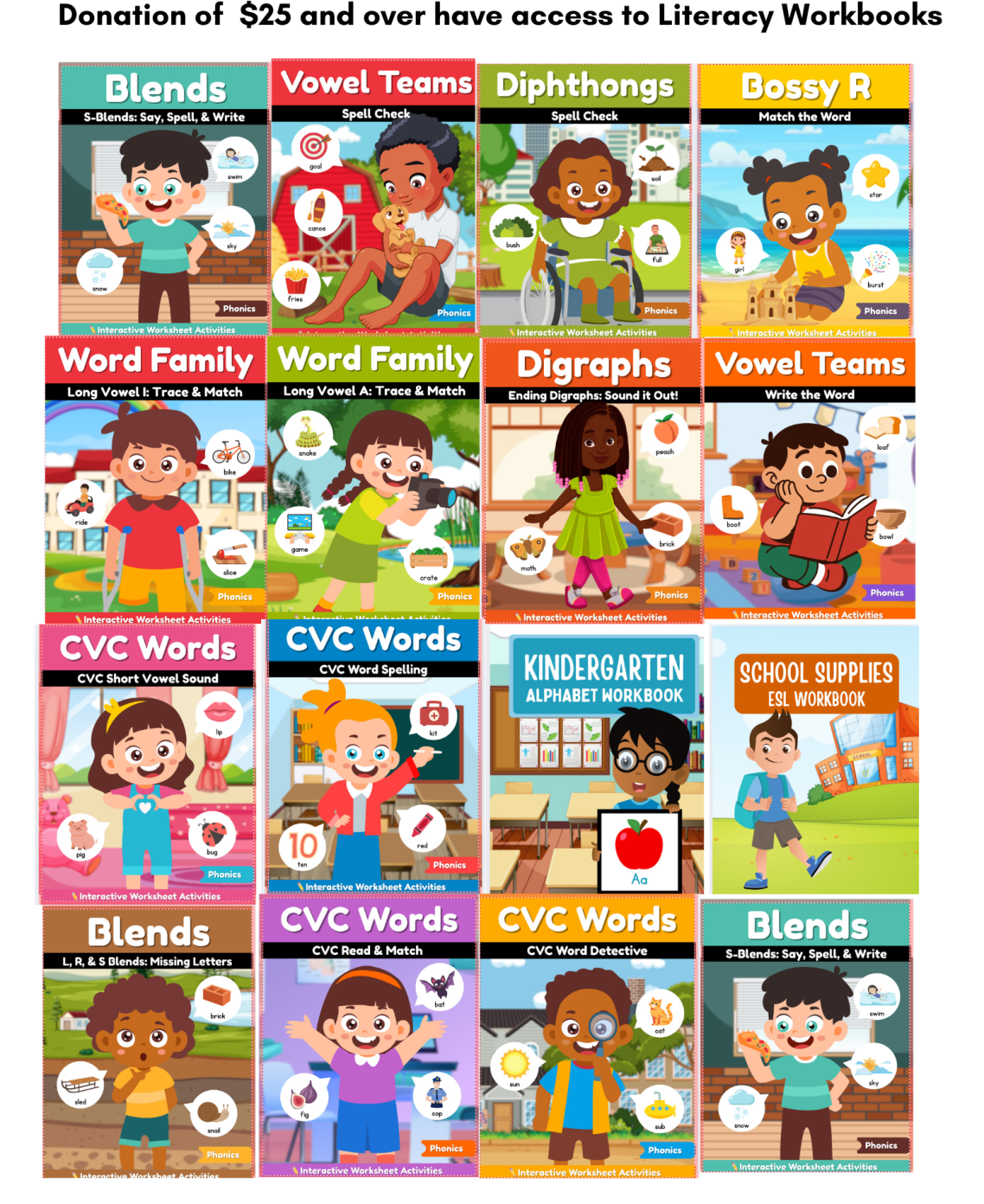 Literacy Workbooks for Kids for a donation of $25 and over. Have access to an unlimited download. A link will be provided.